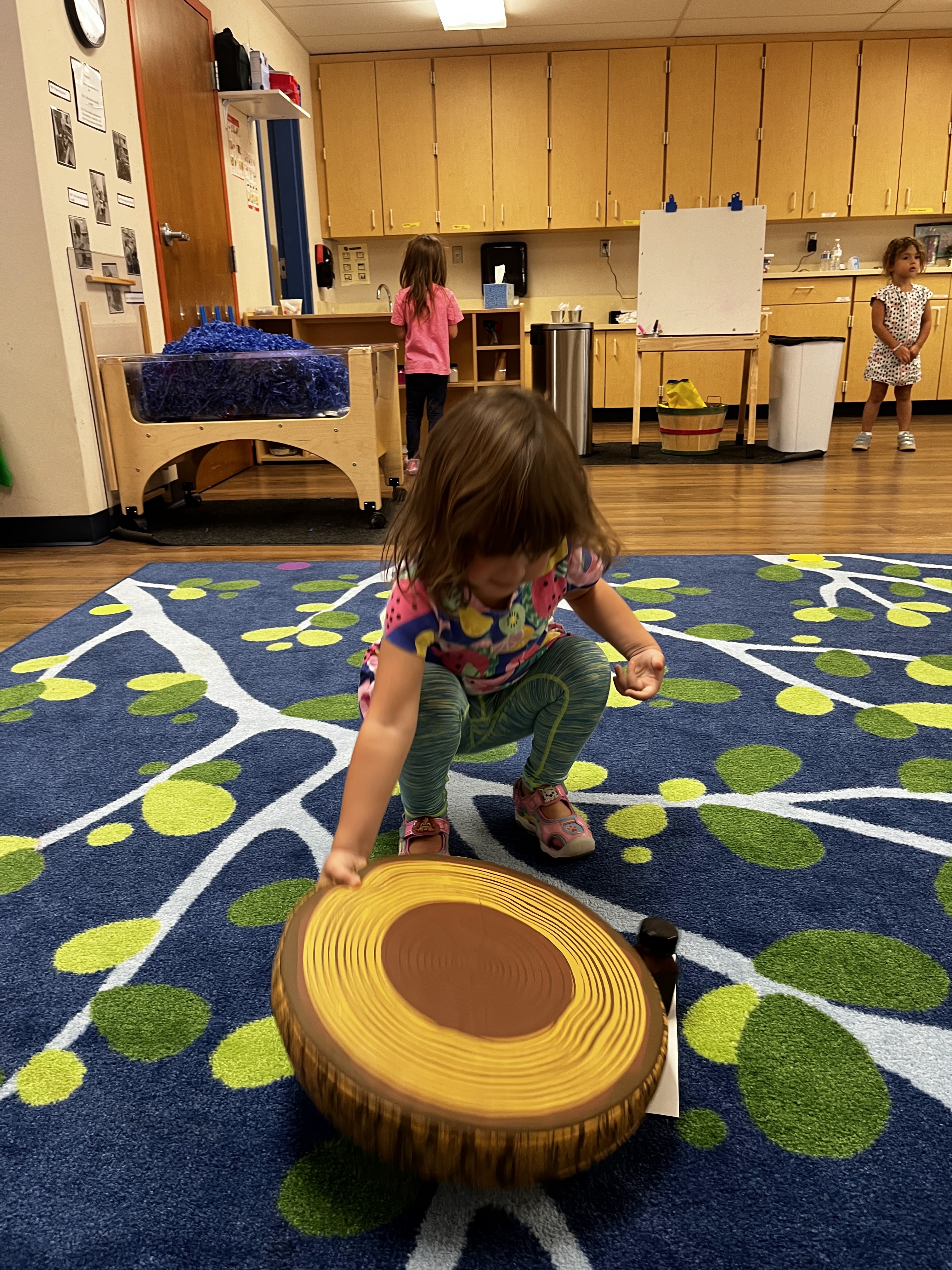 Today brought on a new set of comfortability with finding different things in our classroom! A piece of paper was placed on the floor with a color written on it. The children then explored the classroom and found something that color. We ranged from searching the cabinets, exploring the materials set out and so much more!